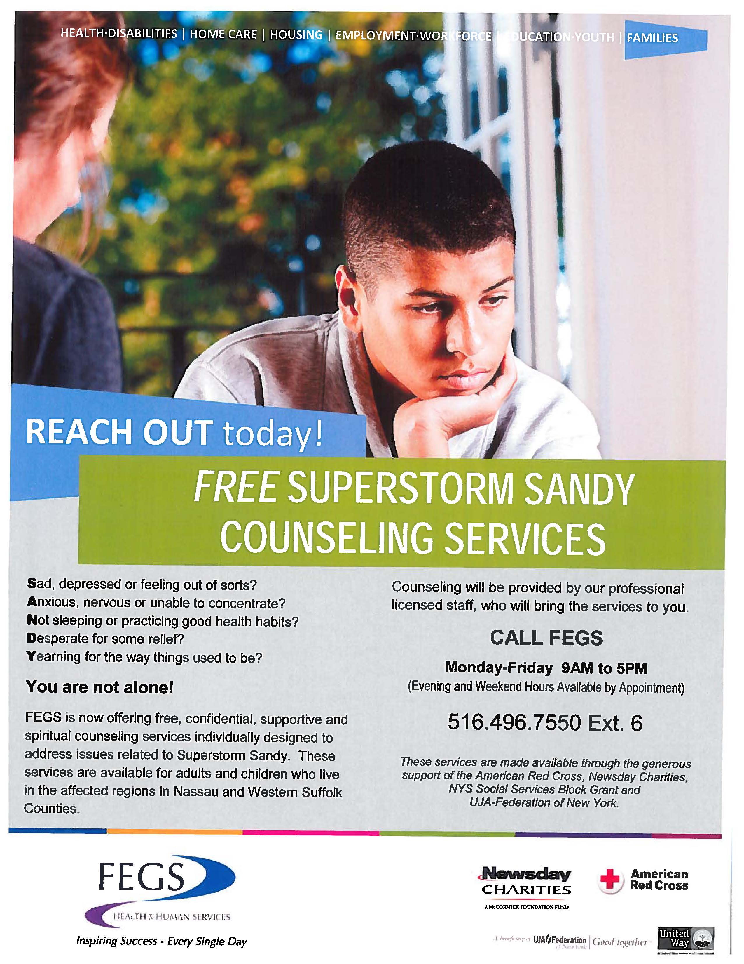 - FEGS Health and Human Services Free Counseling Services (PDF) - Free, confidential counseling services are now being offered to adults and children who have been affected by Superstorm Sandy. For more information, please call FEGS at (516) 496-7550 ext. 6 - Monday through Friday from 9:00 AM to 5:00 PM.