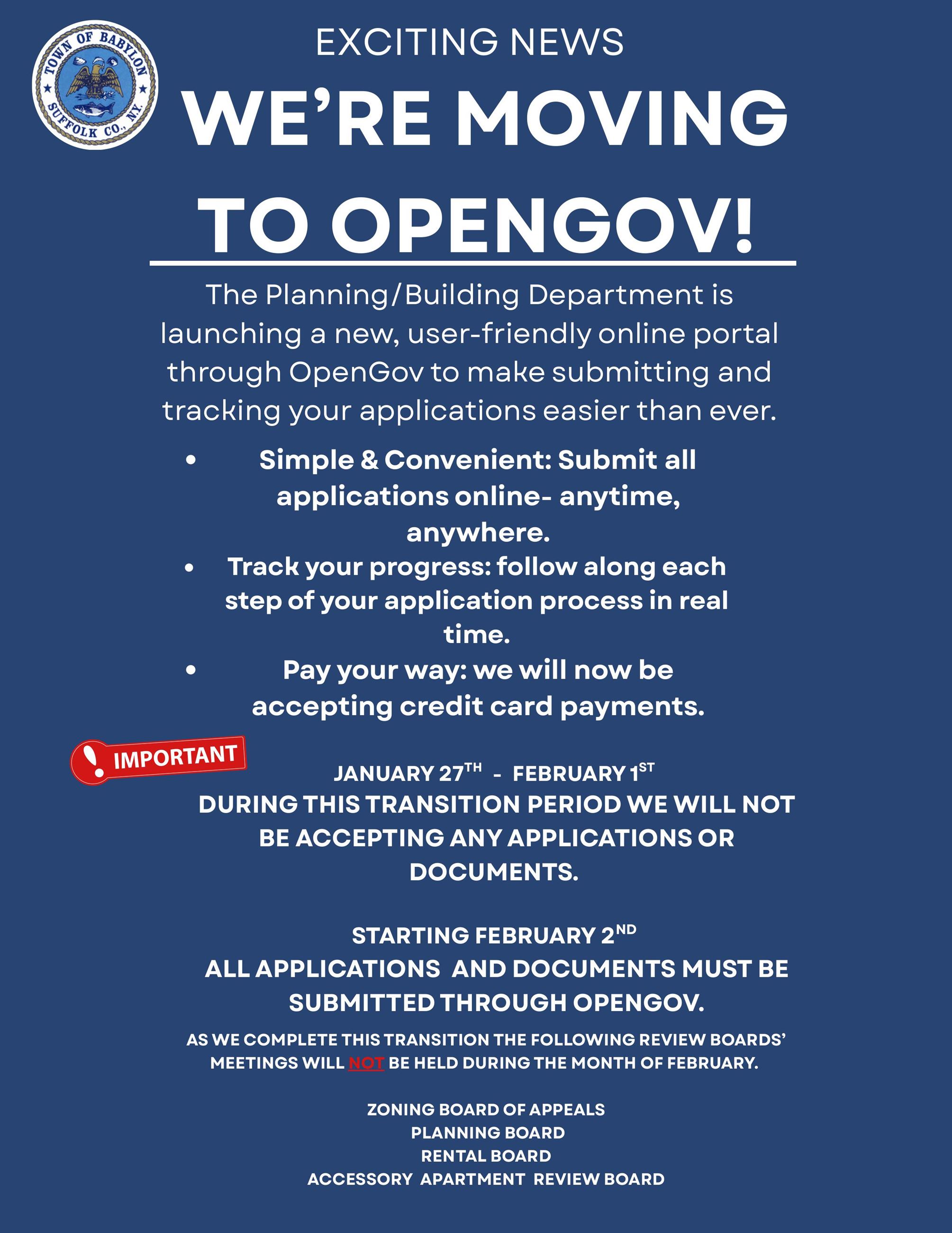 No online applications will be accepted through the Seamless Docs software that is currently used for some online applications beginning January 23, 2026, as the Planning Department transitions to OpenGov. Please note that the Seamless Docs applications online will not be accessible after January 23.